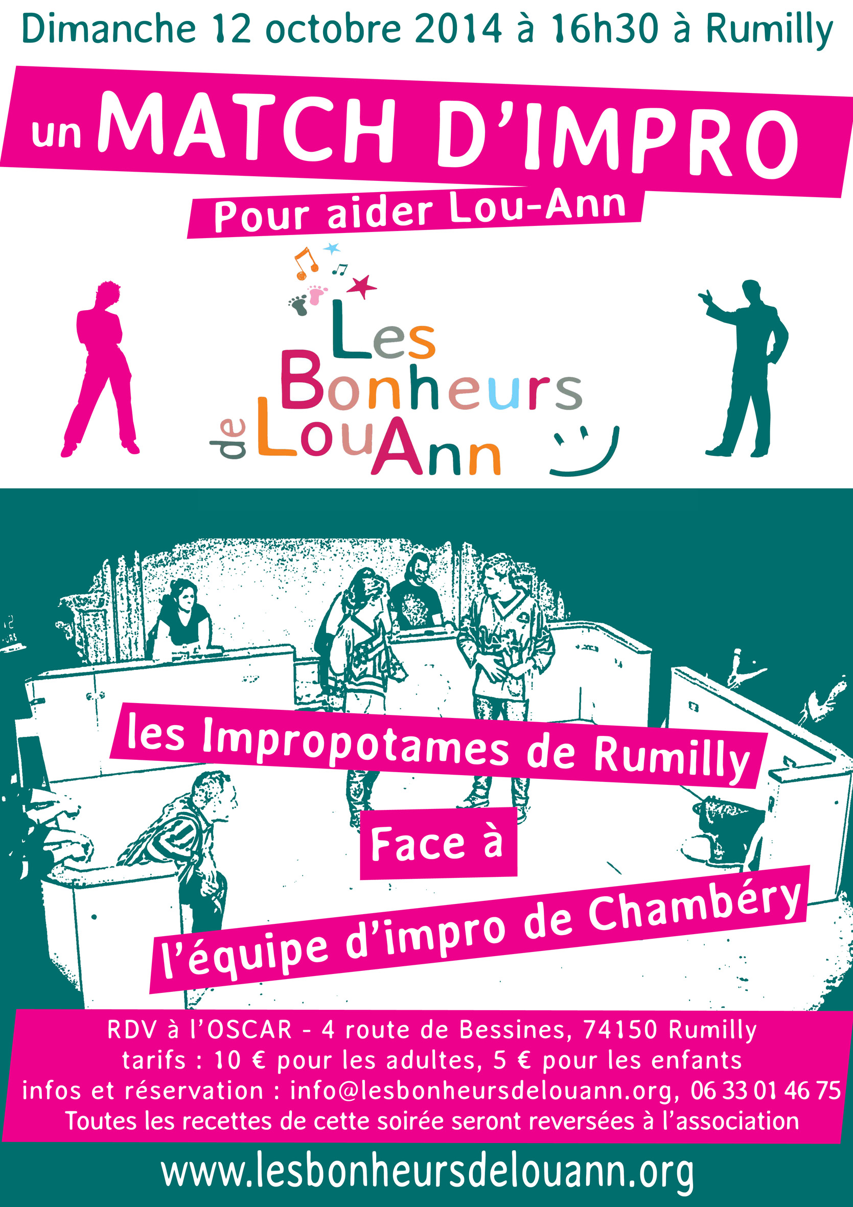 Nous organisons le dimanche 12 octobre prochain un spectacle d’improvisation sous la forme d’un « match d’impro » entre deux formidables équipes se produisant régulièrement sur scène et qui ont décidé de se mobiliser pour aider Lou-Ann.